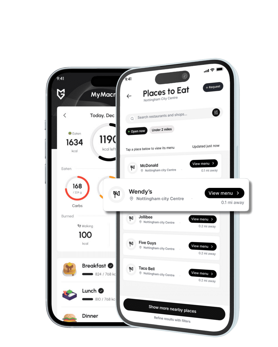 Whether you’re at Nando’s, a local café or a supermarket, our location‑aware macro tracker covers chains and independents across the UK.